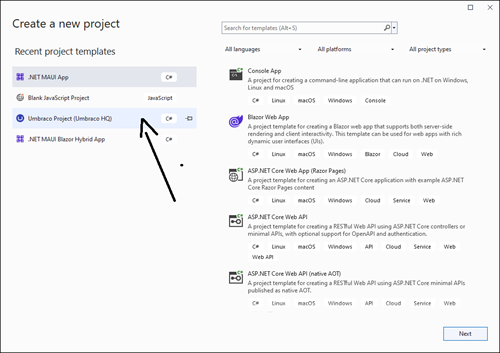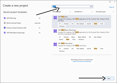 2.In the Create a new project window, select MAUI in the All project types drop-down, select the .NET MAUI App template, and click the Next button: