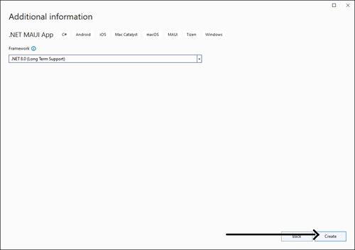 4.In the Additional information window, choose the version of .NET that you'd like to target and click the Create button: